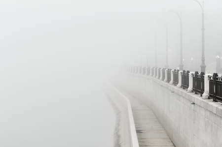 Thick fog on the city embankment. Silhouettes of lanterns and boardwalk fence.