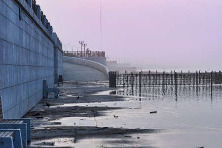 Silt on the embankment of the Amur River during a flood. Heavy fog at dawn. Pigeons walk through the puddles. Fencing lattices. The figure of an athlete in the background. Blagoveshchensk, Russia.