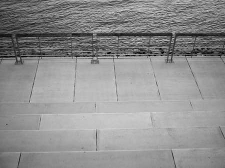 two guys on the city embankment among the flooded stairs look into the water. black and white photos of city landscape.