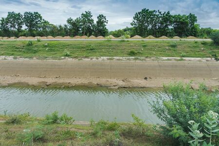 Irrigation canal or irrigation channel in concrete wall Send water from the reservoir to the agricultural area of ​​the farmer that is dry in the rainy season of Thailand. Environmental disaster in agriculture