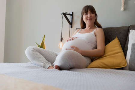 Close-up of pregnant female model holding belly. Woman in dress and cardigan sitting on bed. Pregnancy, expectation concept