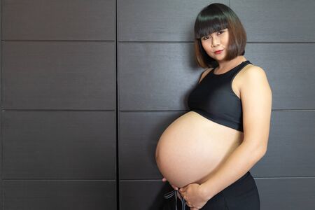 Pregnant woman feeling happy at home while taking care of her child. The young expecting mother holding baby in pregnant belly. Maternity prenatal care and woman pregnancy concept.
