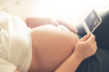 Close up of pregnant woman holding ultrasound scan on her tummy