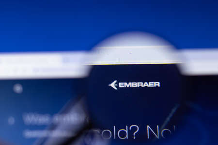 Saint-Petersburg, Russia - 18 February 2020: Embraer company website page logo on laptop display. Screen with icon, Illustrative Editorial.
