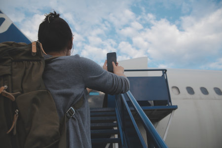 Passengers carrying luggage and backpacks walking up boarding stairs to enter airplane through jet bridge at airport