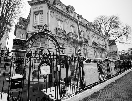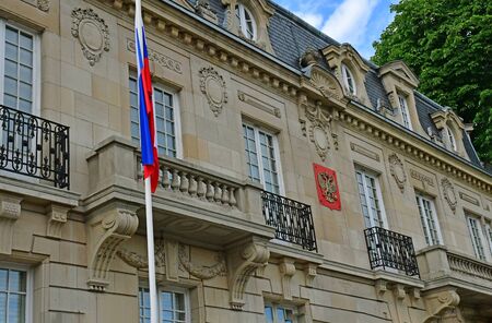 STRASBOURG, FRANCE - MAR 18, 2018: Russian Colsulate architecture building with Russian National Flag pooling staiton for Russian presidential election 2018 voting for President - black and white