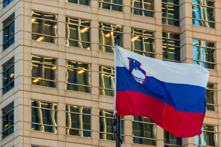 The flag of Slovenia closeup on the background of facade of office skyscraper, Atlanta, USA