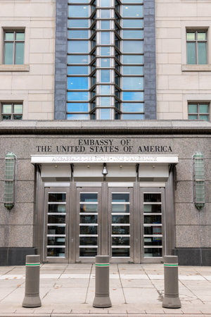 Ottawa, Canada - December 17, 2021: Entrance to Embassy of the United States of America in Ottawa, Canada