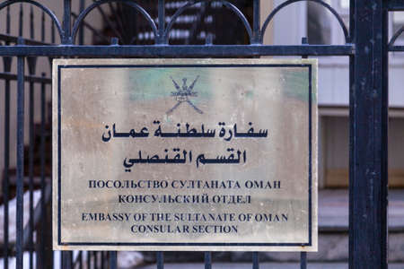 MOSCOW, RUSSIA, - FEBRUARY 11, 2022: A metal plate at the entrance to the building with an inscription in Russian and English languages Embassy of the Sultanate of Oman Consular Section.