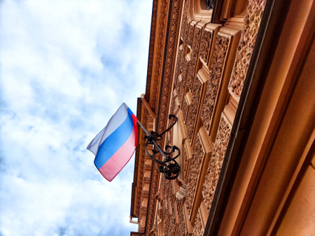 A Russian flag flies proudly against blue sky above a building with intricate architectural details