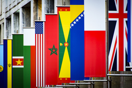 Flags of almost all countries of the northern hemisphere on the facade the building of Hofburg palace in Vienna, Austria.