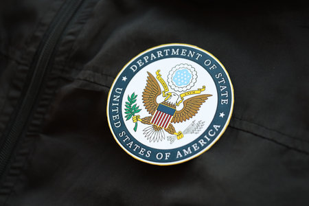 KYIV, UKRAINE - MARCH 9, 2024 US Department of State seal on black jacket uniform close up