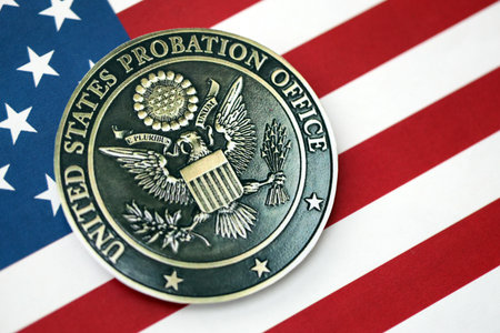 KYIV, UKRAINE - OCTOBER 7, 2025 United States Probation Office emblem on paper US flag close up