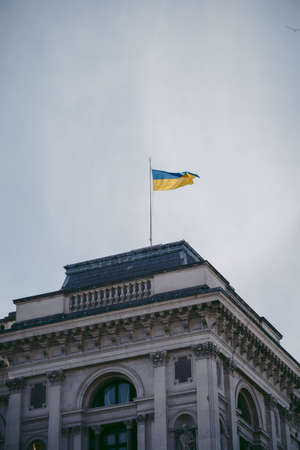 Downing Street, London | UK - 2022.02.26: Ukrainian flags on administrative buildings in central London
