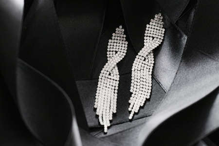 Luxury diamond earrings on black silk ribbon as background, jewelry and fashion brands