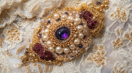 A stunning handmade jewelry brooch featuring a central purple gemstone surrounded by pearls, crafted with intricate detailing, resting on embroidered fabric.