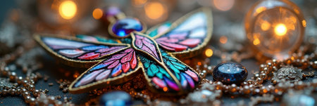Colorful enamel dragonfly brooch on beaded surface with warm ambient lighting. That the image is generated using AI.