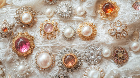 A stunning collection of vintage brooches featuring pearls and gemstones arranged on delicate lace, ideal for fashion and jewelry enthusiasts.