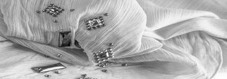 white fabric with glued decorative faceted stones. texture background with bright colorful stones, texture background design. Silk pattern,