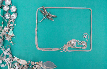 A set of silver jewelry. Space for the text. Blue and silver jewelry on a blue background. Top view.