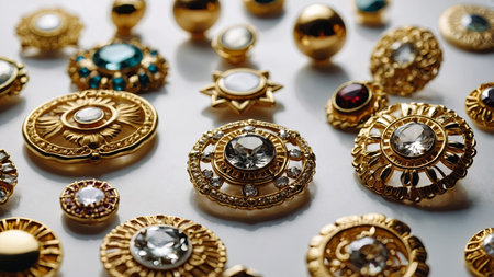 AI Generated. A collection of shiny gold brooches displayed on a white table Perfect for fashion or jewelry concepts