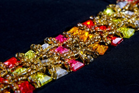 Macro view of beaded embroidery on textured bright-hued textile surfaces