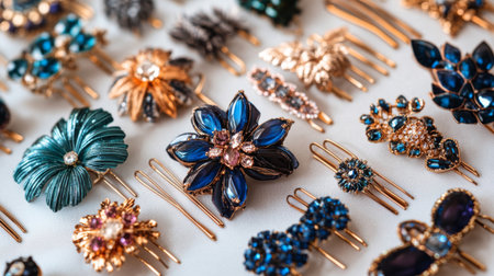 An image of stylish hair clips with jewel tones and elegant designs, arranged to showcase their refined and fashionable appearance.