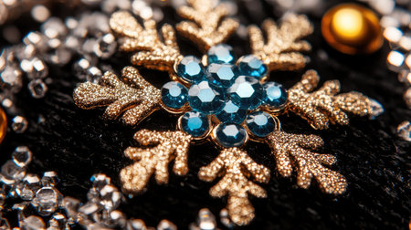 Close-up view of a snowflake-shaped embellishment. The embellishment is made of gold-colored metal with many small, blue crystals set in it. It has a textured surface and is affixed to a dark-colored fabric or material. The image also includes a multitude of small crystals and beads in different sizes and colors around the main embellishment.