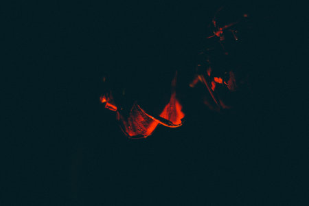 Photo of hot sparking live-coals burning, spark of bonfire.