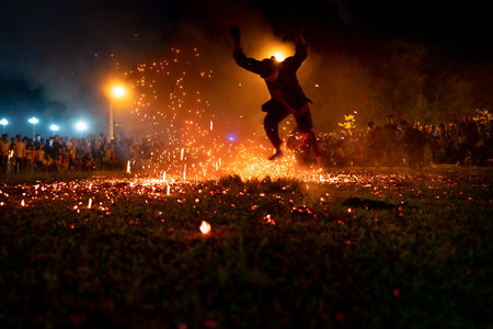 Lam Binh Tuyen Commune, Tuyen Quang province, Vietnam - September 14, 2019: The traditional fire dance festival of the Pa Then ethnic people to thank the gods for blessing a good crop year, a prosper