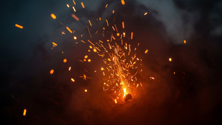 Dynamic fire sparks flying against a black background create a mesmerizing visual effect