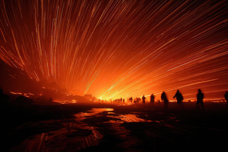 This image showcases a dynamic display of glowing embers and scattered sparks, likely from a fire or intense heat source. The composition features vibrant orange and red hues contrasted against a deep black background. The visual style uses motion blur to emphasize movement. Suitable for illustrating concepts like energy and warmth, this image could be used in various commercial applications.