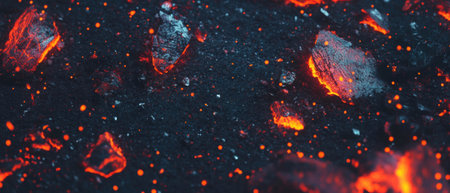 Rough black sand texture with glowing lava fragments under low light conditions