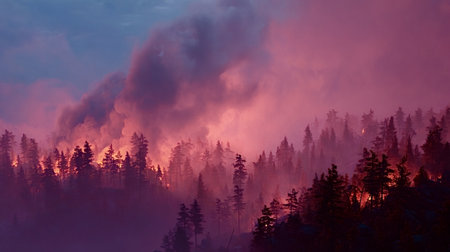 Wildfire burning through a dense forest at night, causing thick smoke to rise and illuminate the sky with a vibrant pink and purple glow, symbolizing environmental disaster and destruction