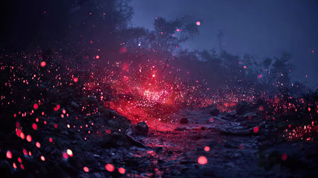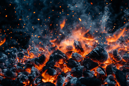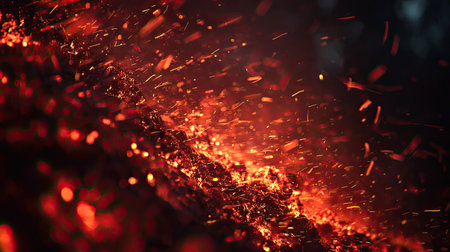 Glowing embers scattered over a dark background create an intense visual display