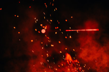 Glowing fire embers scatter warmth against a dark background in an evening display