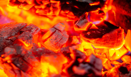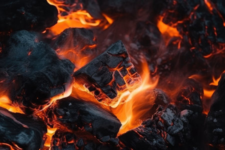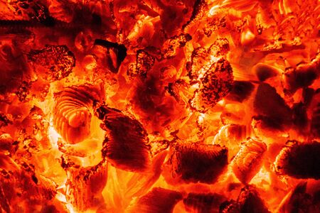 Close up of glowing fire and embers on hot coals for grilling or barbecue banner design