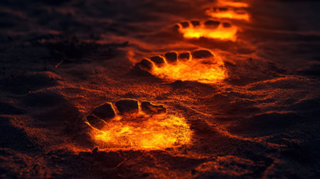 Fiery footprints light up a shadowy path, creating a dramatic image of power, progress, and an intense journey