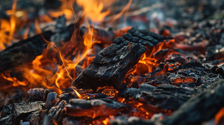 The smoldering embers of a dying fire glow with residual heat, nestled among the charred wood and ash.