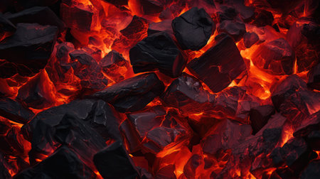 This image features a close-up of glowing charcoal embers. The composition showcases textured black and red forms, suggesting heat and energy. The lighting emphasizes the fiery glow within the charcoal. This image could be used for various projects needing a backdrop, texture or a symbol of warmth and energy.
