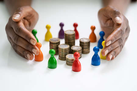 Diversity And Inclusion Concept. Hand Protecting Hand Colored Staff Pawns In Circle