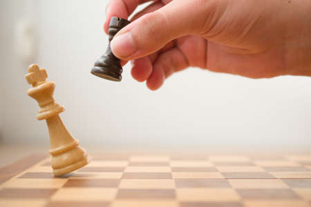 Hand holding a black tower while it's hitting the white king in a check mate, chess game.