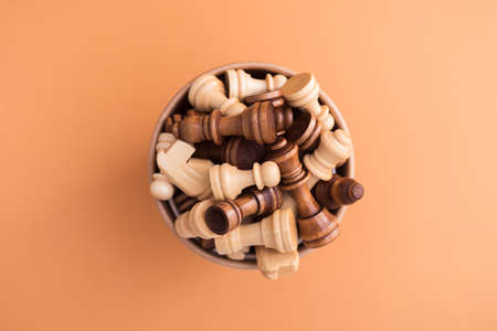 Top view of wooden chess board and chess pieces scattered on the white background.