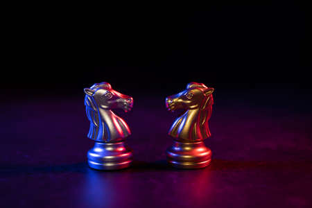 Golden and silver horse chess pieces Invite face to face and There are chess pieces in the background. Concept of competing, leadership and business vision for a win in business games