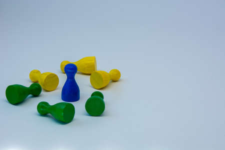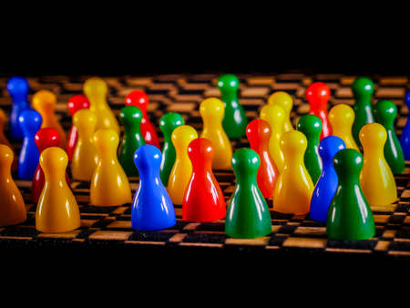 Different colors and shapes of pawn pieces and dices from board games, on a wooden background.