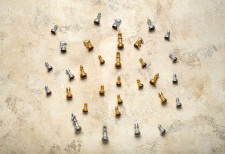 Chess pieces on a stone table. cinematic light. Intellectual game background.