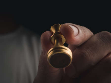 Close up gold queen chess piece in human hand in the air on dark background, below view. Hand moving queen chess figure on chess game competition. The winner Leadership concept.