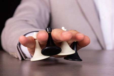 Concept of bullying, harassment, discrimination, racism. A hand holds and covers chess pieces.