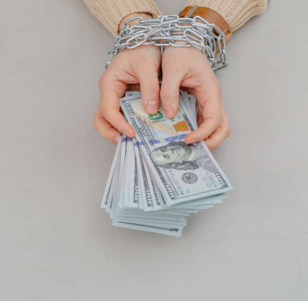 Hand wrapped in a steel chain holds sddollar bills on black background. crime concept