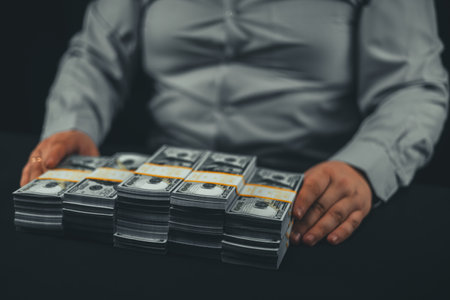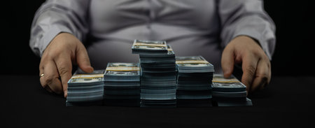 Neatly folded stacks of hundred dollar bills on a black background in front of a man. Close-up. On his sides are beautiful stacks of dollars in bundles. Big money concept.